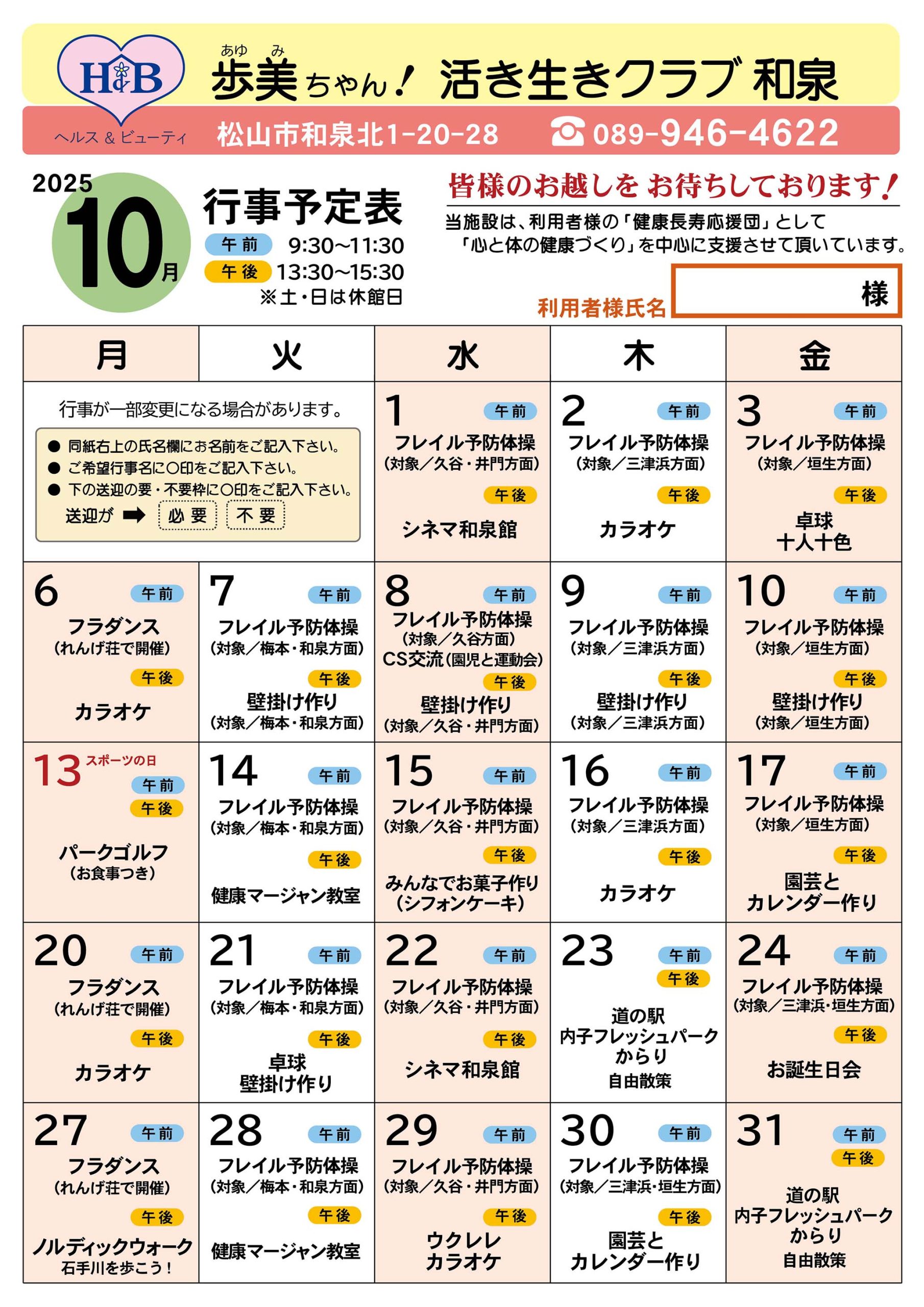 「歩美ちゃん!活き生きクラブ和泉」の10月行事予定です。