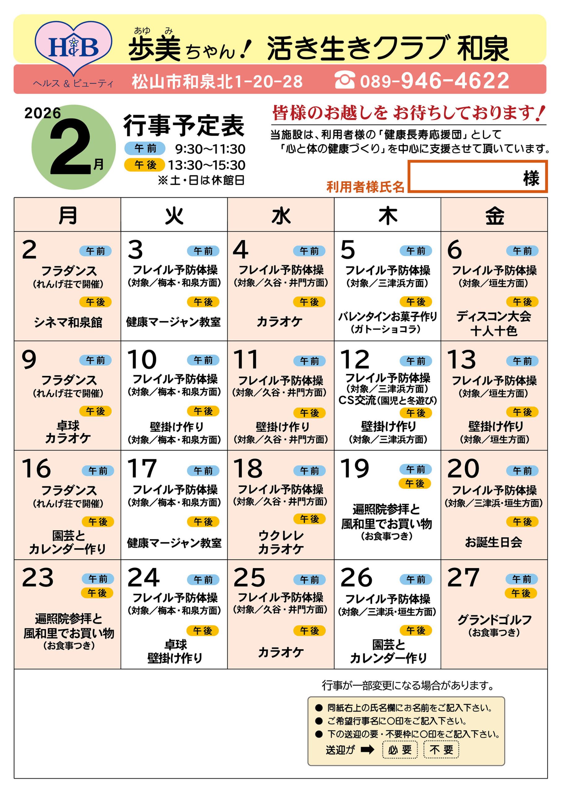 「歩美ちゃん!活き生きクラブ和泉」の2月行事予定です。